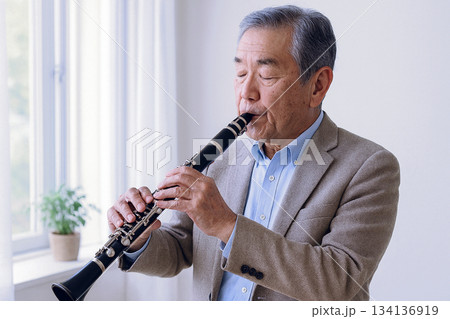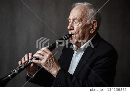 Jazz clarinet player performing on stage in jazz club, vintage black and white image in retro style, portrait of elderly clarinet player filled with passion for music, concept about jazz festival