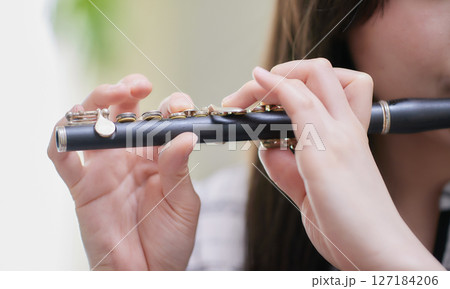 フルートを演奏する子供の手元 吹奏楽やクラシック音楽の楽器演奏風景