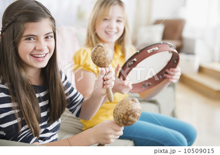 Two girls playing music on instruments