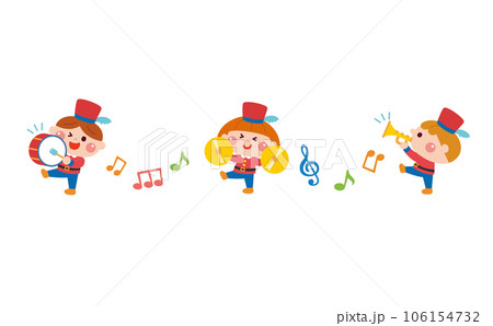 Set of kids playing different musical instruments in marching band parade cartoon vector illustration