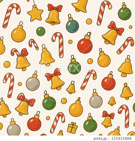 クリスマスオーナメントシリーズ:キャンディケインとベルの賑やか背景