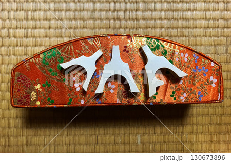 琴の口前袋の上に置かれた、三つの可愛らしい琴柱