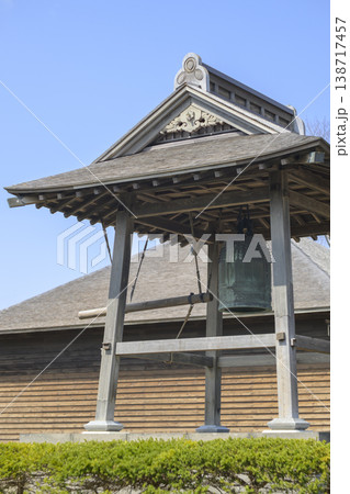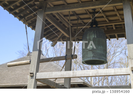 深山鎮魂の鐘と青空 山頂から祈りを捧ぐ静謐の風景