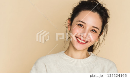 若手日本人女性がオフホワイトのセーターで穏やかに微笑むポートレート