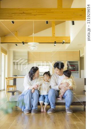 ソファに並んで座るカメラ目線で笑顔の50代の夫婦 イメージ