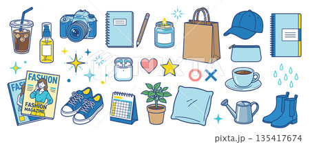 日常の小物アイコンセット|カメラ・コーヒー・文房具・雑貨のかわいいイラスト素材