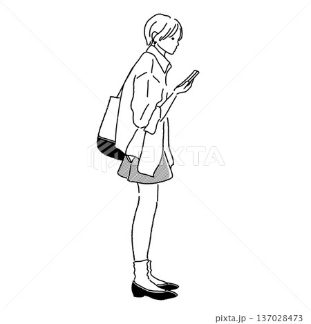 ビッグシルエットシャツ×ショートパンツの春コーデ スマホを見る大学生女性 全身イラスト