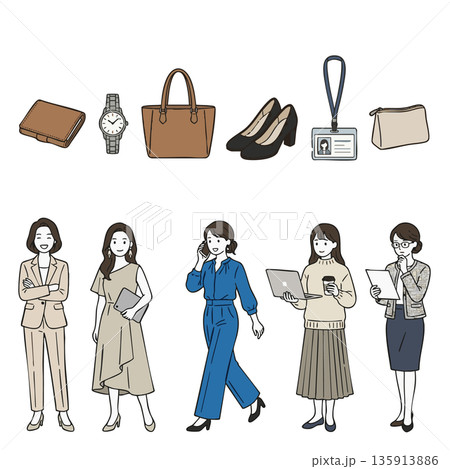 ビジネスウーマンの仕事着と持ち物のイラストセット