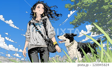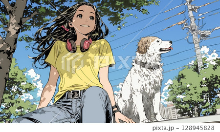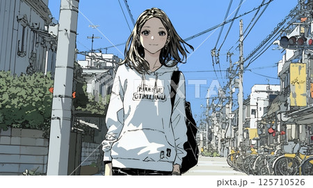 音楽を聴きながら歩く女性のラフな人物イラスト