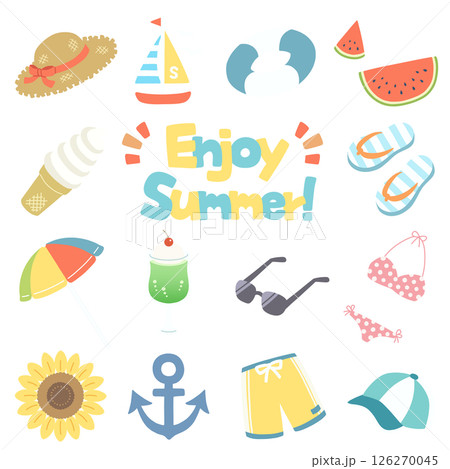 夏のイラストアイコンセット/ポップで明るい季節素材(線なし)