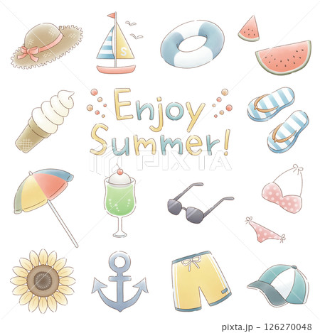 シンプルでナチュラルな夏のアイテムセット:水彩