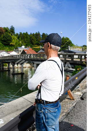 港で空を見上げる高齢者 撮影協力:隠岐シーサイドリゾートみやび様】