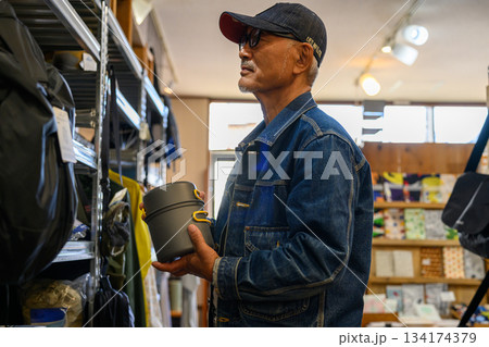 グランピングを楽しむシニア男性の横顔【撮影協力】隠岐シーサイドホテルみやび