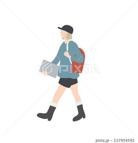 ノートパソコンを持って歩く女子大学生 リュック通学シーンの人物イラスト