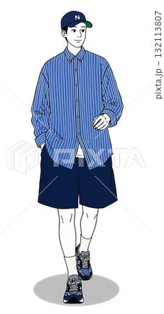 キャップとオーバーサイズジャケットを着て歩く男性のストリートカジュアルファッションイラスト