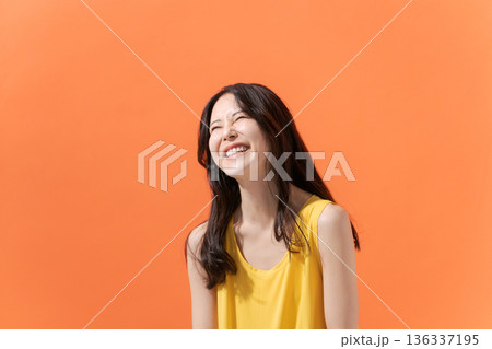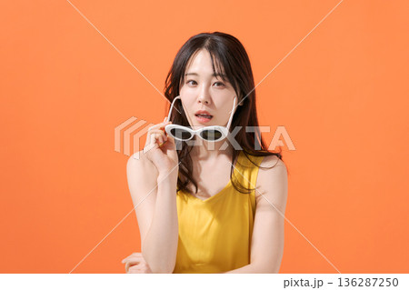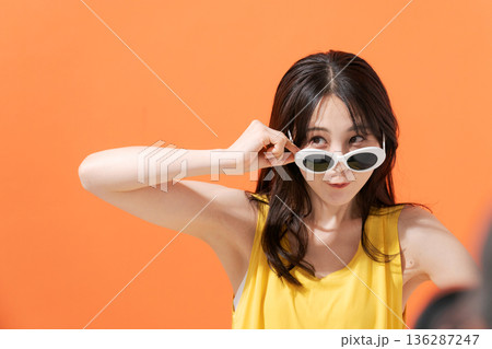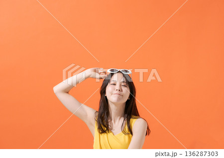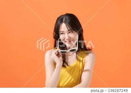 夏イメージ 黄色バック タンクトップを着ている若い女性のポートレート