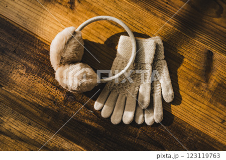 木のテーブルに並べられた冬のニット帽と手袋