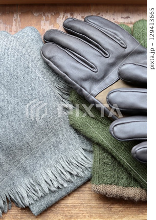 メンズ用のウールマフラーとレザーとウールの手袋
