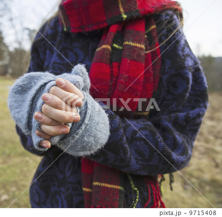 A woman in a tartan scarf and knitted woollen mitts, keeping her hands warm in cold weather.