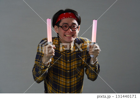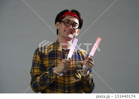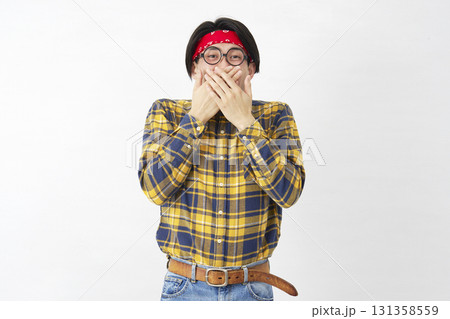 アキバ系の男性 笑顔で驚く 白背景 カメラ目線