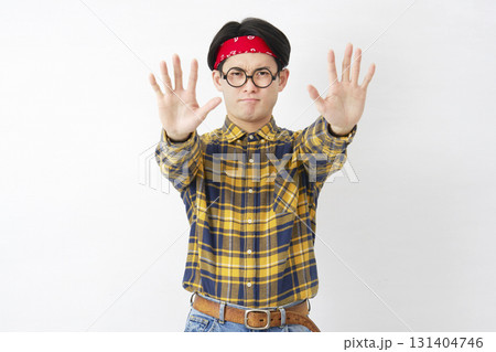 アキバ系の男性 ギブアップのジェスチャー 白背景 カメラ目線