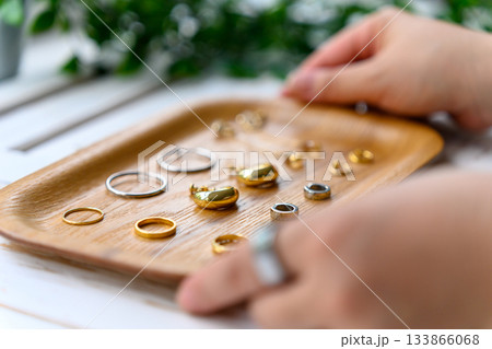 木製トレイに並べられた様々なゴールドとシルバーの指輪やパーツ
