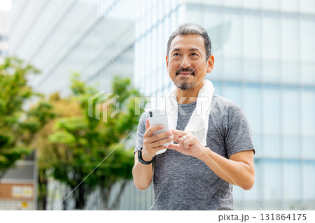 スマートフォンの画面を見るバックパックを持った60代の男性