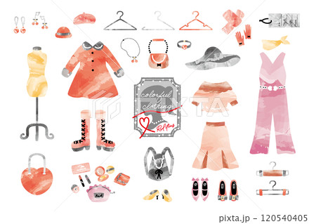 水彩風ファッションアイテムイラストセット【レッド系】