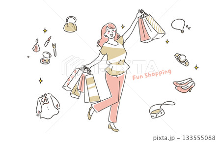 ショッピングを楽しむ女性のシンプルタッチのイラストデザイン素材