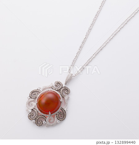 テーブルに並べたアクセサリー、白バックに豪華な宝飾品