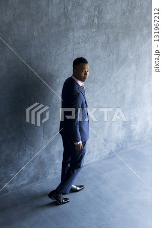 壁にもたれて腕組みをするグレーのスーツを着たミドル男性ビジネスマン