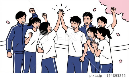 満開の桜の下で円陣を組みハイタッチをして青春を謳歌するジャージ姿の高校生たち