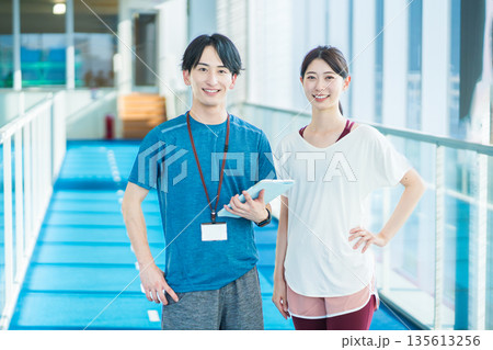 スポーツジムでトレーナーとトレーニーの男女。撮影協力:「スポーツクラブ&サウナスパ ルネサンス 幕張