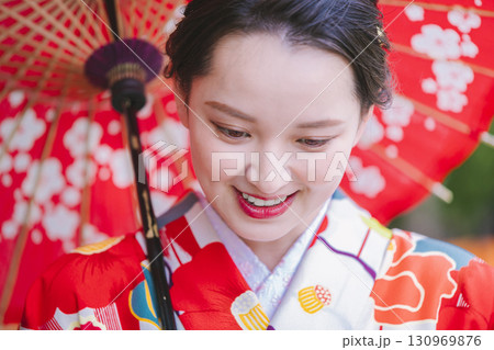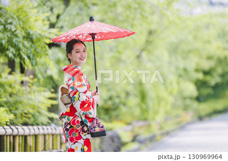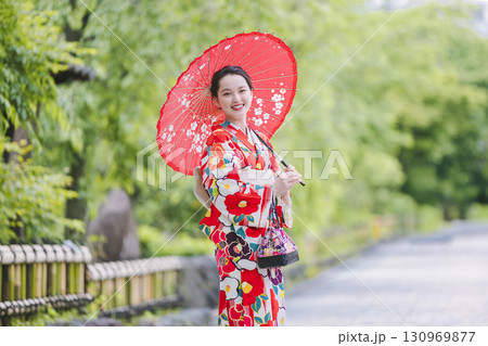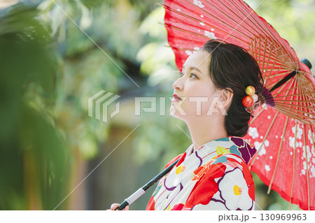 和傘を持った着物姿の若い女性