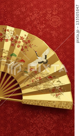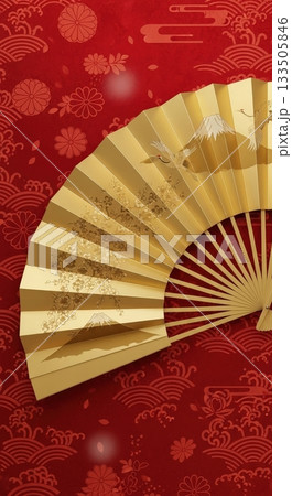 正月の赤い和柄背景に豪華な金の扇を配置したスマホ用背景画像