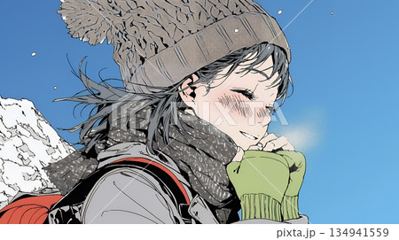雪が舞う冬の日、優しく微笑む女子学生(マフラー・青春・イラスト)