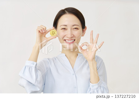 ビットコインを持つ40代の女性 ガッツポーズ 白背景