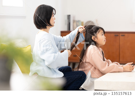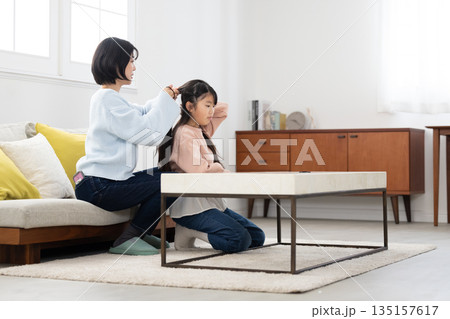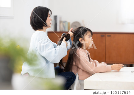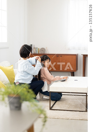 自宅のリビングで母親に髪をセットしてもらう小学生の女の子