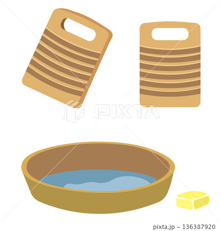 レトロな洗濯板と桶と固形石鹸のイラストセット