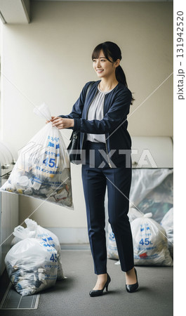 ゴミ袋を持ち中身の臭いや重さに顔をしかめる女性