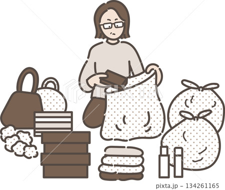 断捨離、不用品を処分する40代女性のイラスト 線画のみ