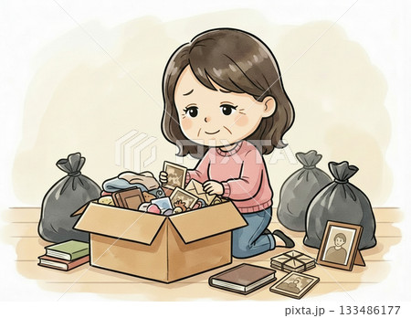 思い出の整理をする女性のイラスト|片付け・実家じまい