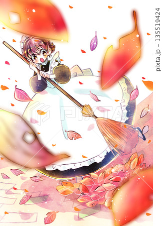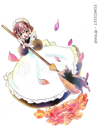 ほうきを持っているメイドさん 落ち葉 舞い散る