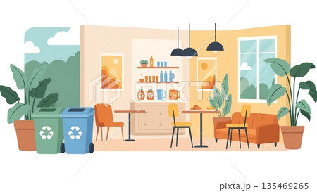 環境に配慮したカフェとリサイクルゴミ箱