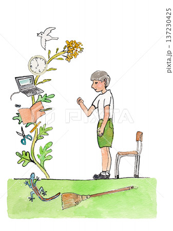 学校のイメージと立ち止まる男の子の水彩イラスト