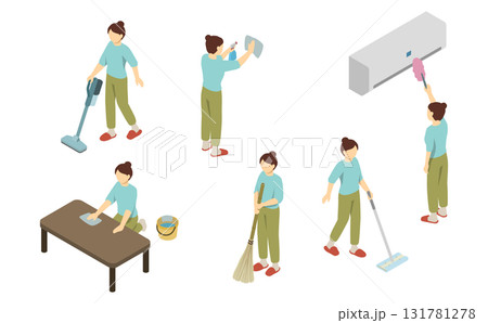 さまざまな家事ポーズをとる女性キャラクター、柔らかい色調、親しみやすい雰囲気、背景は白