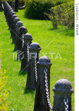 博多港船着き場の太いチェーンに巻かれた係船柱(ボラード)