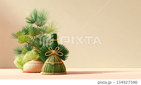 松の枝を生けたミニマルな陶器の花瓶 静物写真