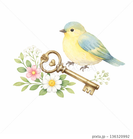 水彩風 小鳥とアンティークキー 花の装飾 切り抜きイラスト素材