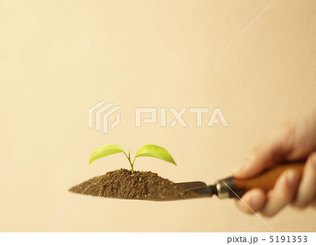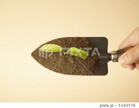 芽が出たスコップを持つ手